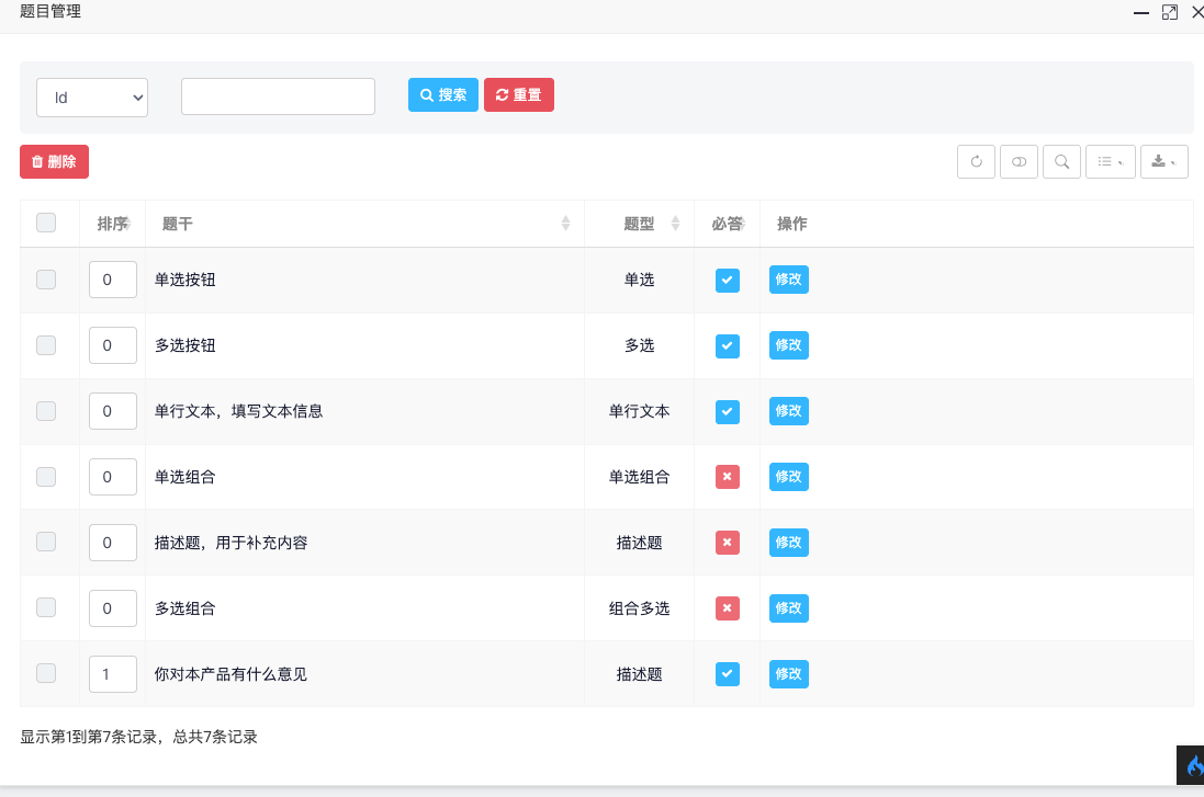 在某个问卷下集中管理所有题目,支持多种常见题型。