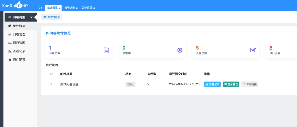 6. 访问与权限:生成访问链接与二维码;依赖迅睿后台权限与菜单,管理员按权限使用问卷与答卷功能。